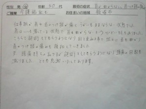 首が曲がらない、首の付け根痛み 40代 女性 介護福祉士 飯塚市より