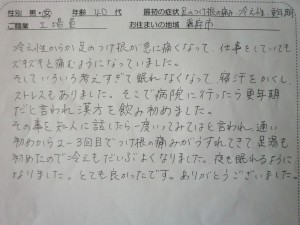 また、自分でも出来るケアも丁寧に教えて頂き、身体を動かしたり、半身浴をしたり・・・と前向きに頑張ることができています。