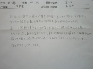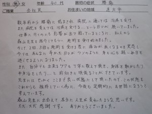 仕事に行くのにも影響が出て困っているところに、知人から森山先生を紹介してもらい、施術を受け始めました。
