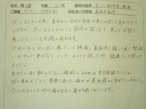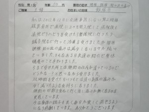 来院された時は腰背部の筋肉にかなりの緊張がみられ、仰向けやうつ伏せで寝ることもまともに出来ない状態でしたので、まず下肢からのアプローチで腰背部の筋肉を緩めて寝れる状態にもって行きました。